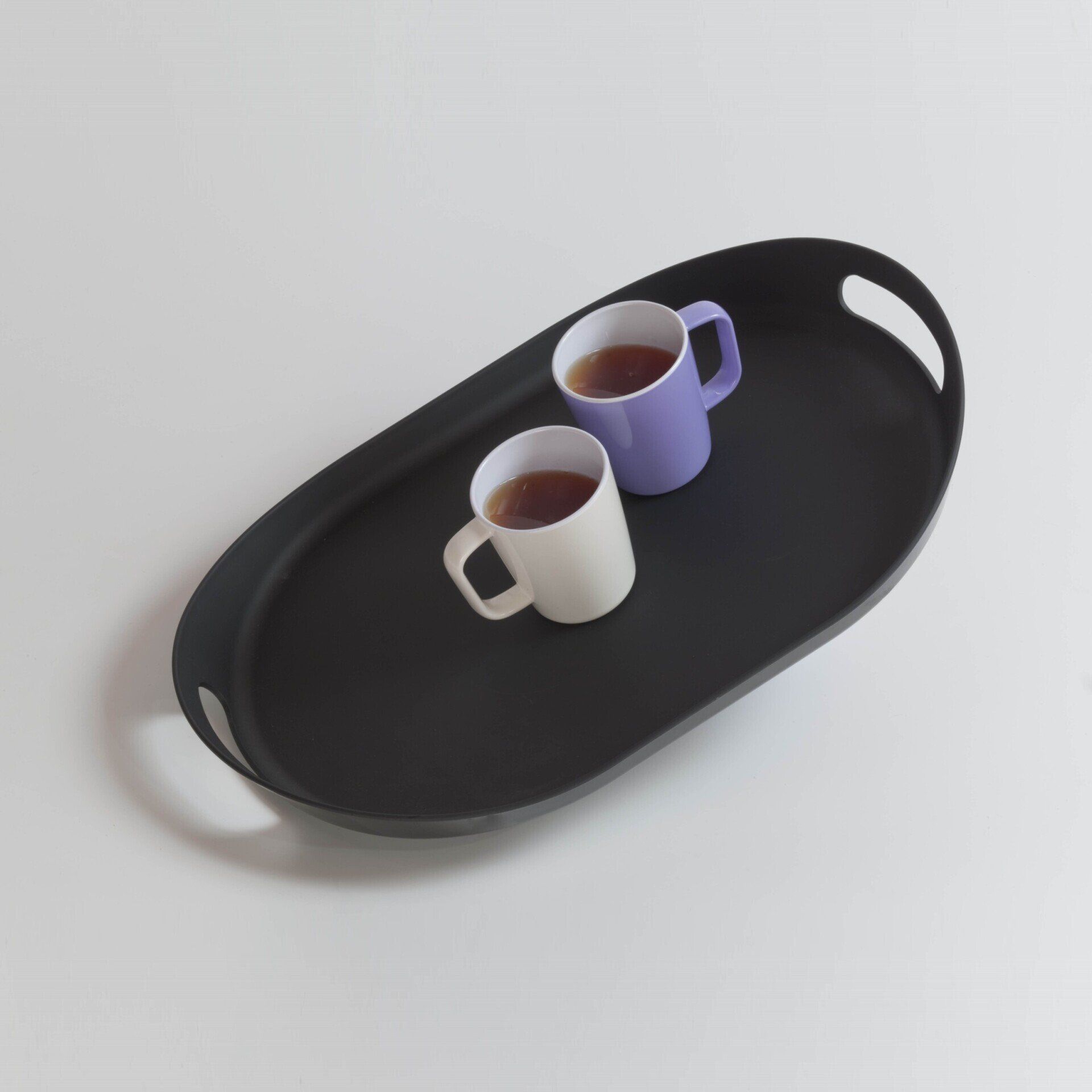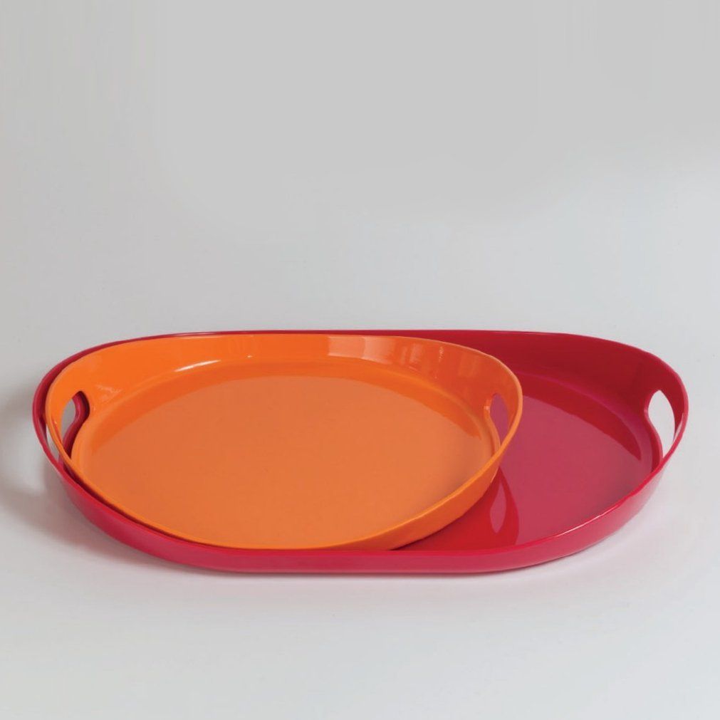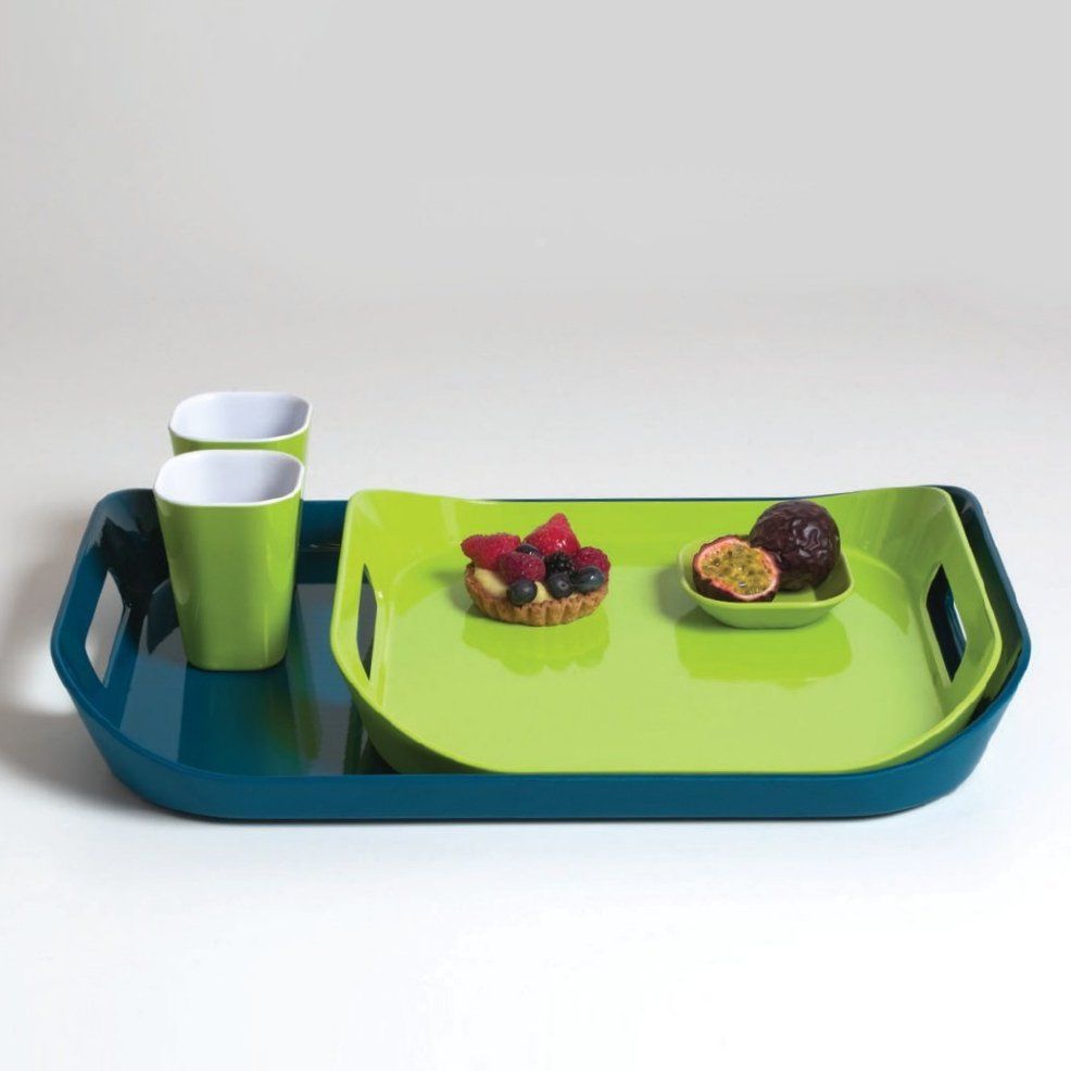 Trays with handles for example, in at least two stackable sizes to be sold in twin sets and two shape variants, curved and squared.