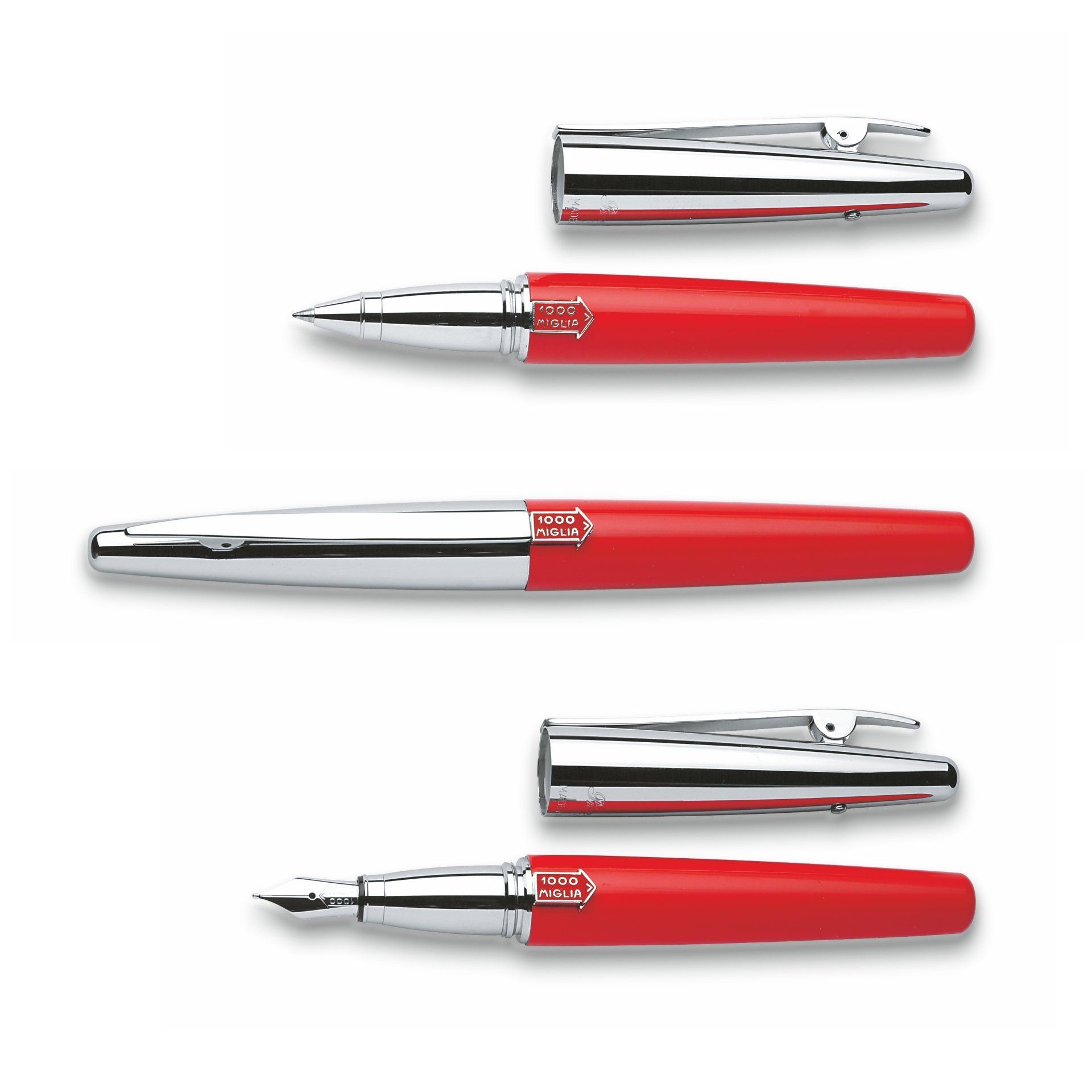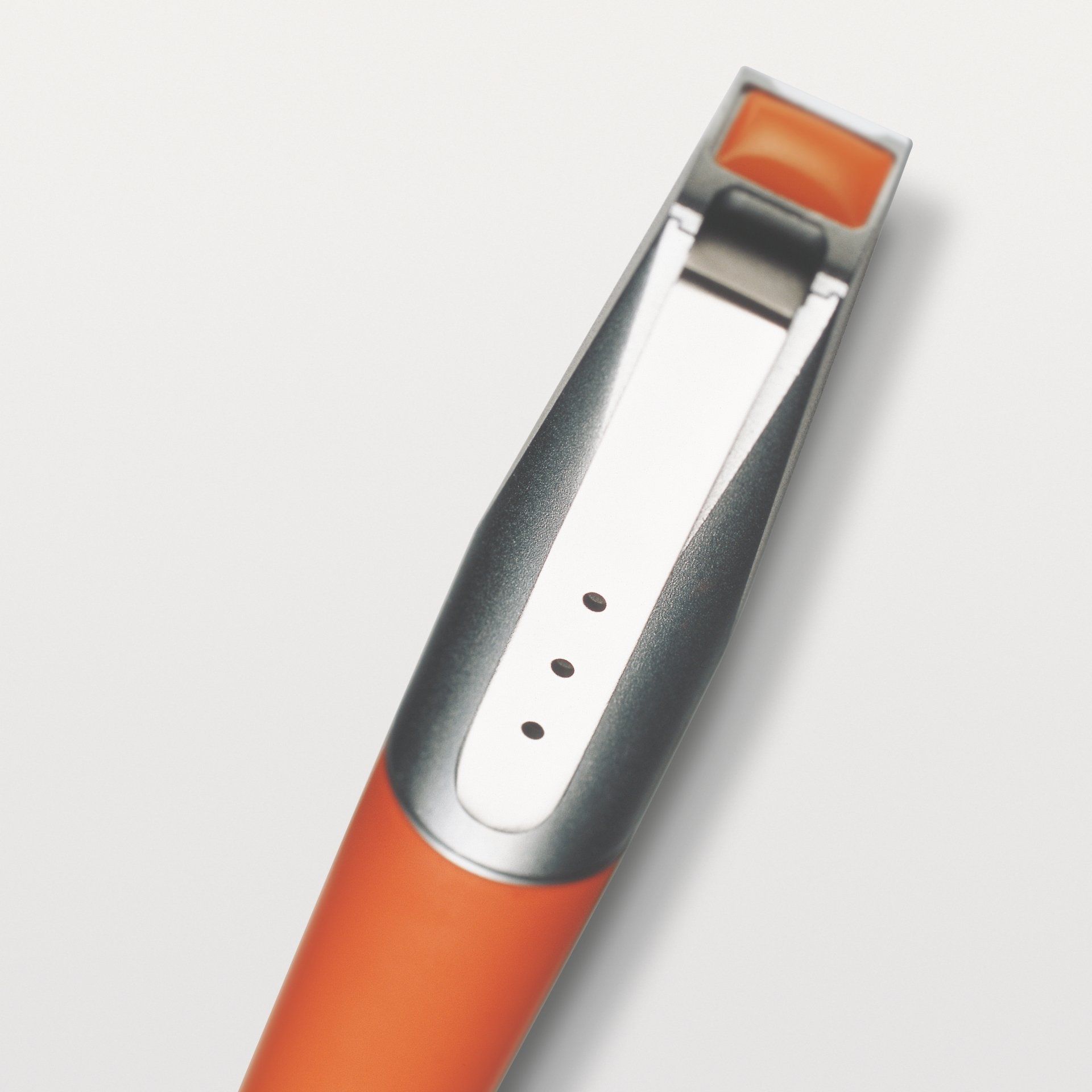 The cap is curved following the classical radius which is manifest or hidden in many details of the Bugatti eternal style, while the clip, set in a game of playing surfaces, redesigns the car's handle. All parts are then treated before being plated: most of them are hand brushed while the others are hand polished to create that slight elegant contrast of different light reflections. The complex barrel design is obtained with an ideal crossing of curved splines, and the lateral polished surfaces sink in the pen's body like hypothetical air intakes following the body of the Veyron. Also the fin in relief on the barrel is taken from the car's line which runs all over it. The sapphire glasses are milled with the same caution and precision used in high-end watch-making in order to obtain a calibrated and invariable housing, and they are tested against temperature