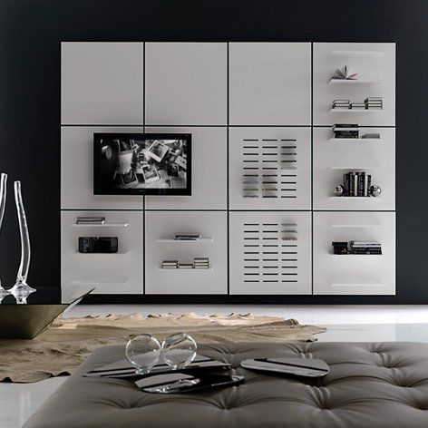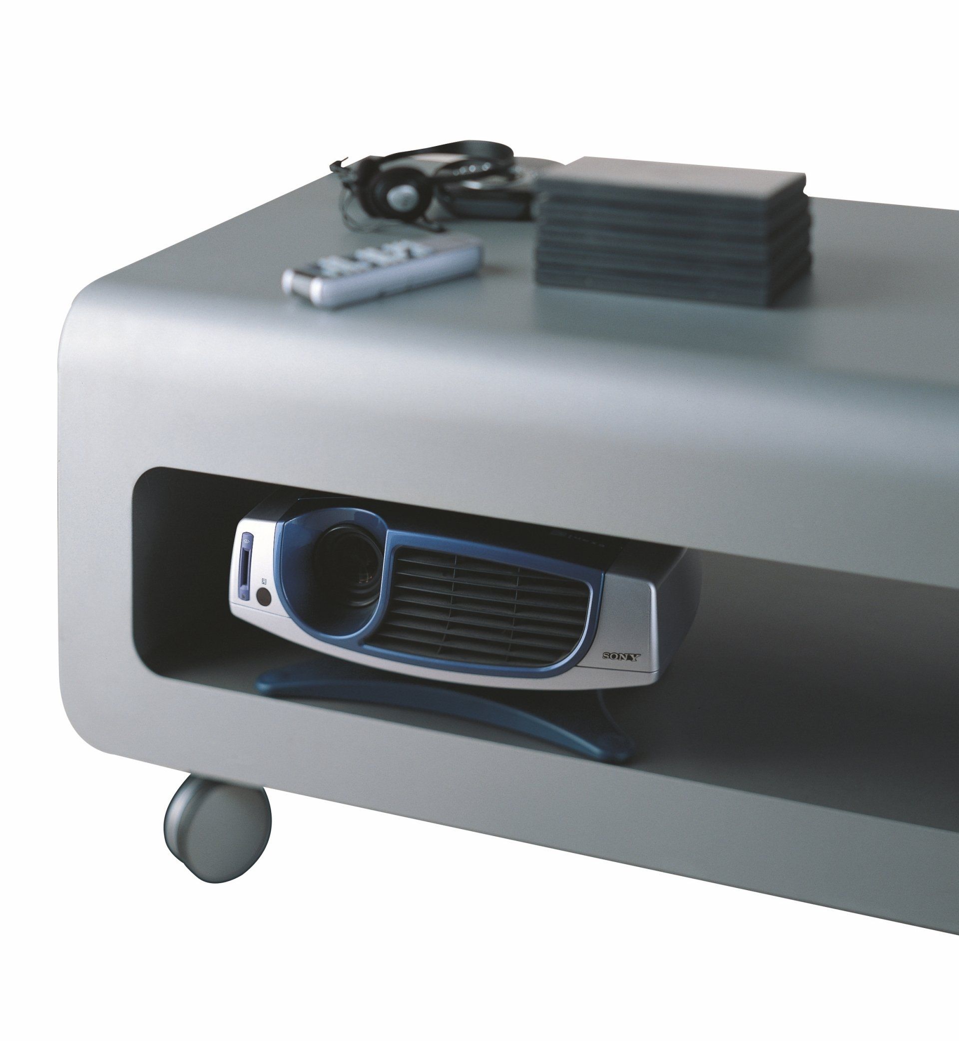Its vertical development on the wall allows in a limited space to have an adjustable height of the screen, the housing of up to four peripherals for a complete home-cinema system, the application of side shelves for speakers and DVD storage, all while hiding completely from view any electrical wiring.