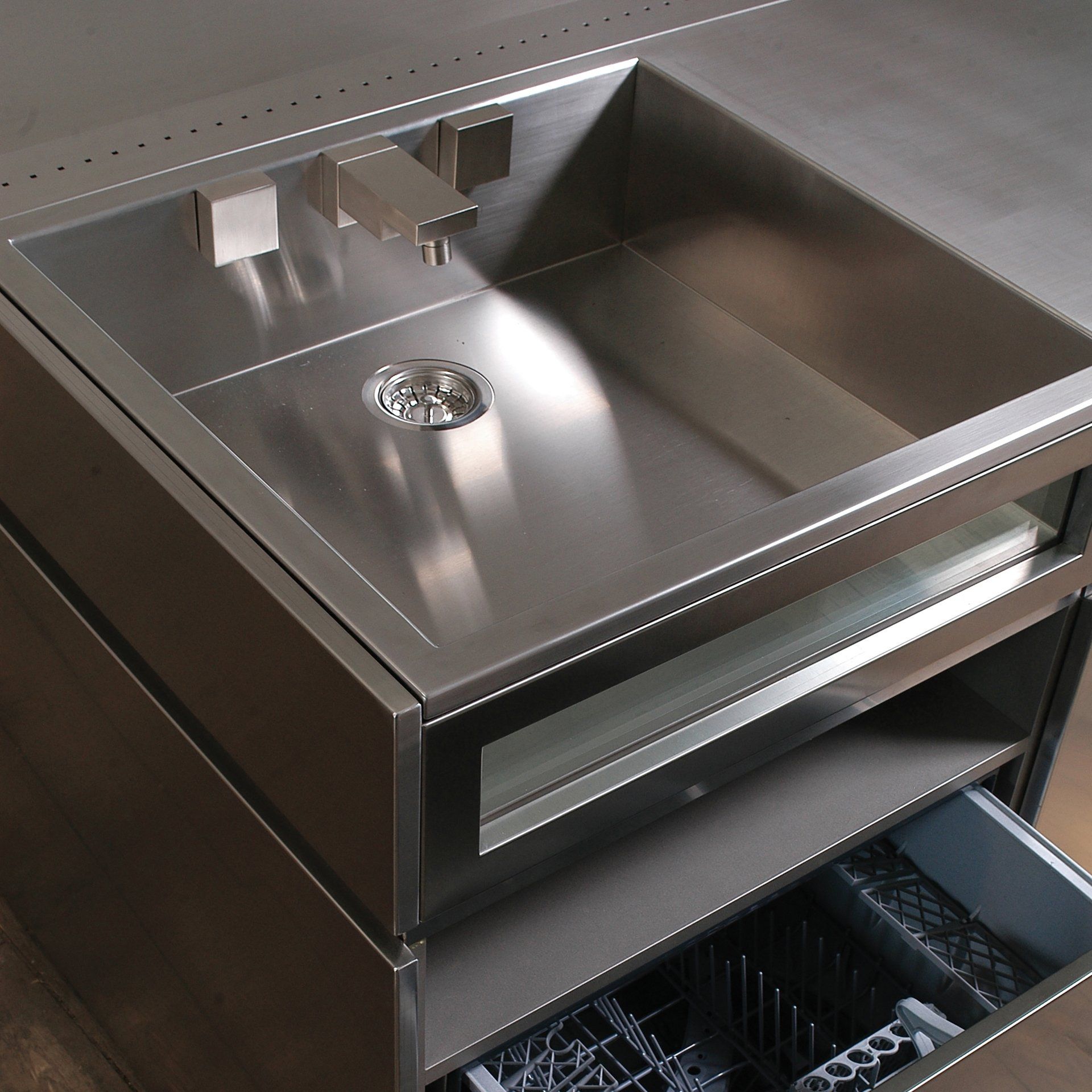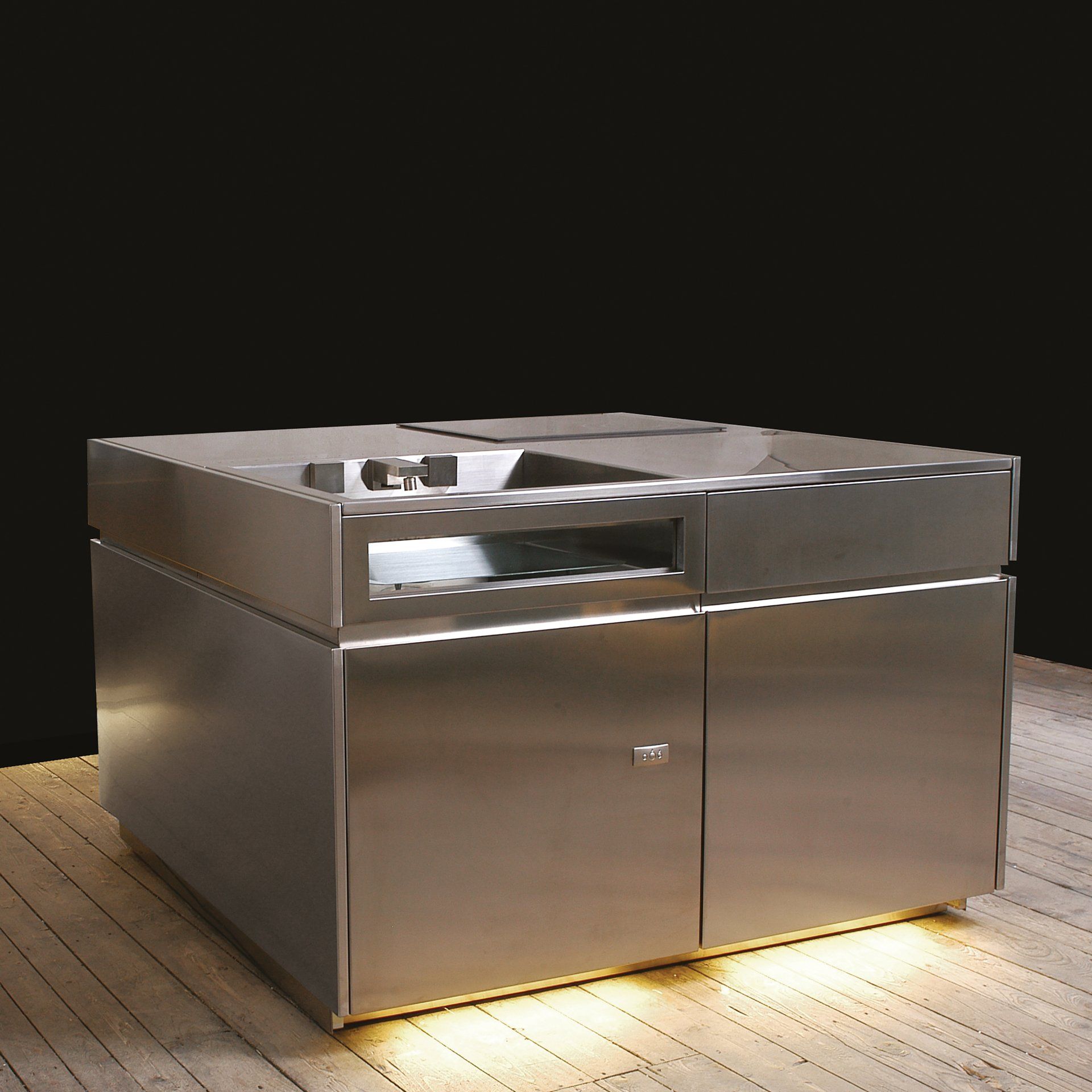 None of the surface areas, including the horizontal surface, have protrusions but 135x135x90 cm of stainless steel contain a large sink with a suggestive transparent front wall, a dish washer for 6, a 130 litre under unit fridge, a cooking unit made by ceramic glass, a multipurpose oven, two large drawers and a pantry unit.