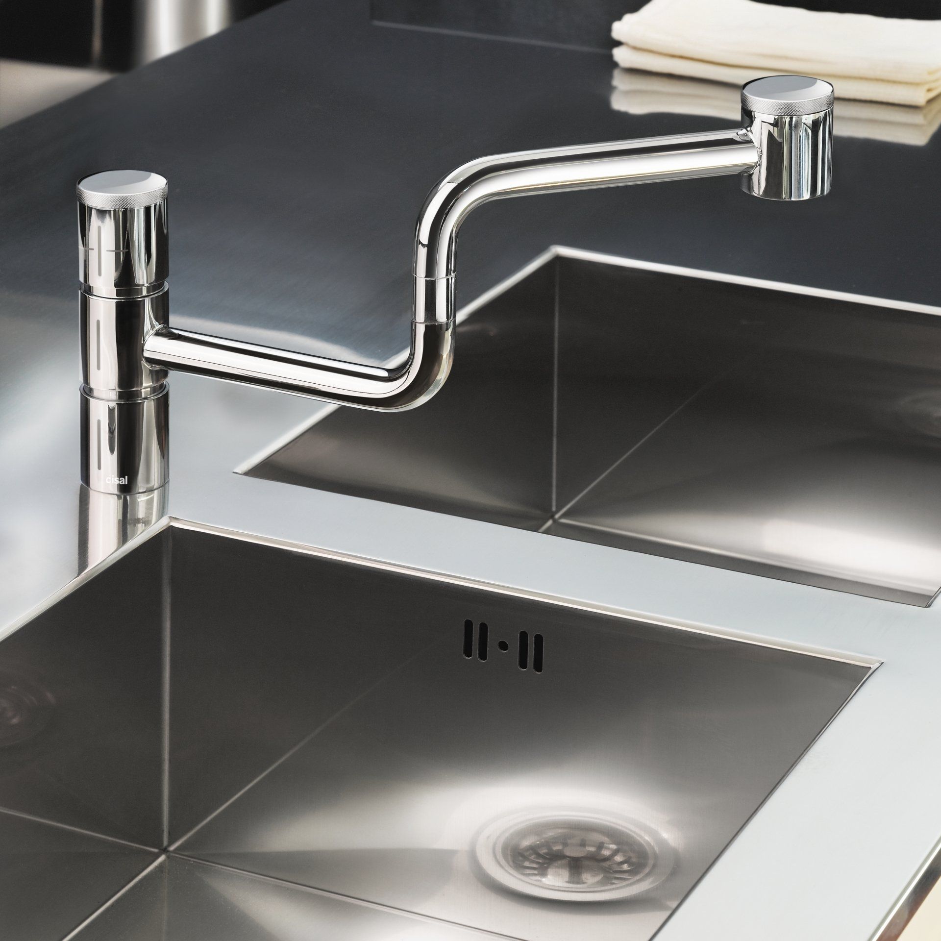 Note the liftable faucet aligned with the top, a true innovation of the project, which at that time did not exist on the market and was later developed by various manufacturers. Luigi Trenti designed some versions, one of which was developed by Gessi for this project.